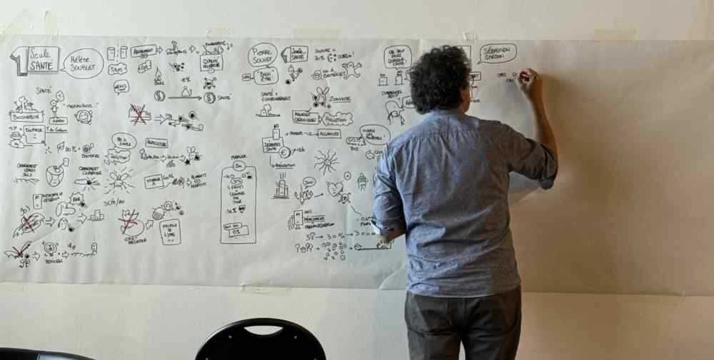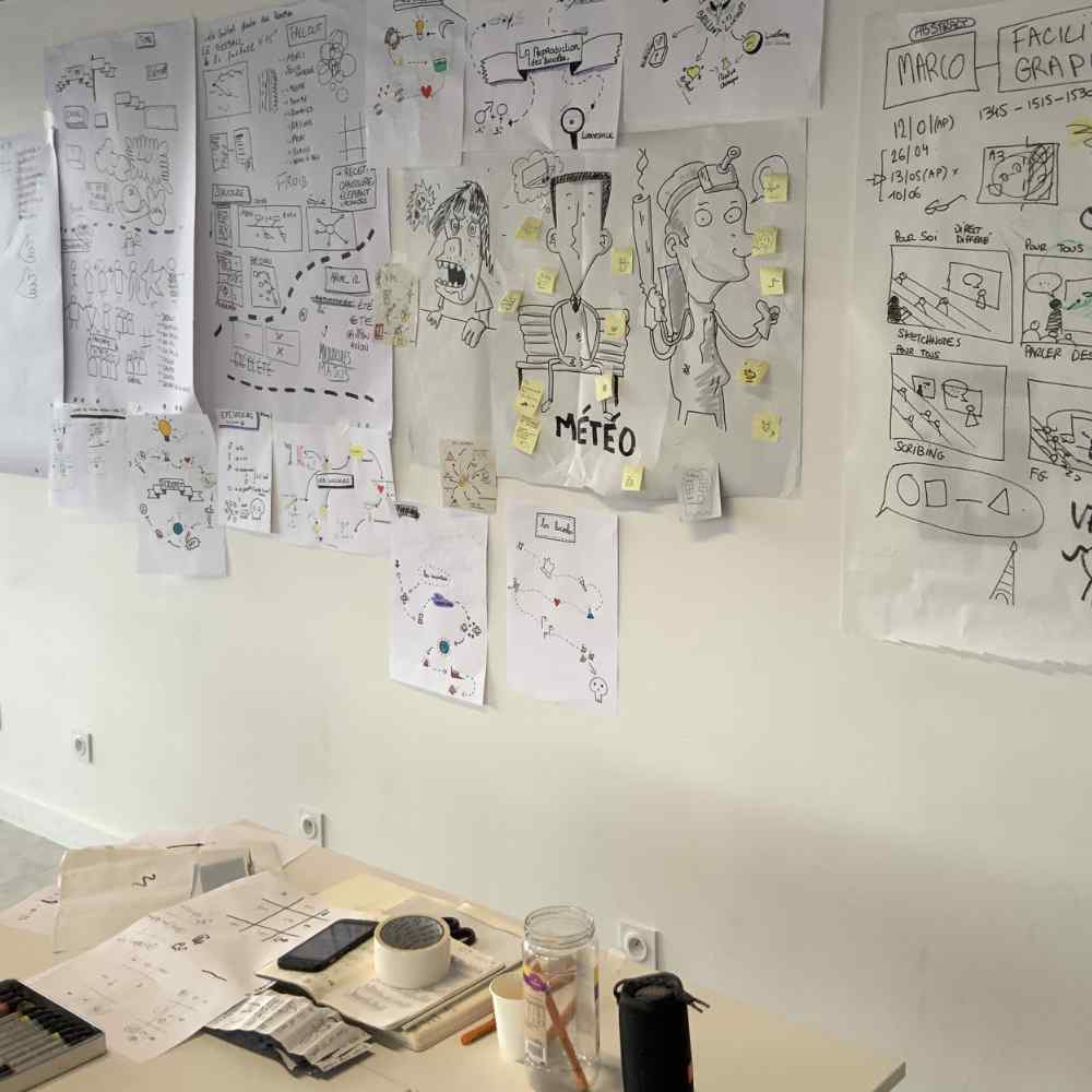 J’ai développé une passion pour la prise de notes et en particulier pour le sketchnoting. Le scribing est juste un prolongement de cette technique puissante de la facilitation graphique. Elle permet de mettre en place une certaine forme de cohésion au fil de mes rencontres.