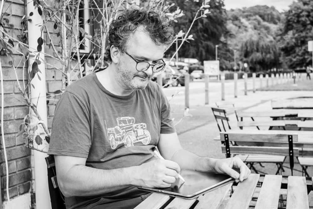 Même dans mes œuvres numériques, le geste reste fondamental. Je dessine sur iPad avec le Pencil. Je travaille dans ma salle à manger, entouré de mes livres, mes carnets, de papiers d’art, d’encres, et de mon matériel numérique.