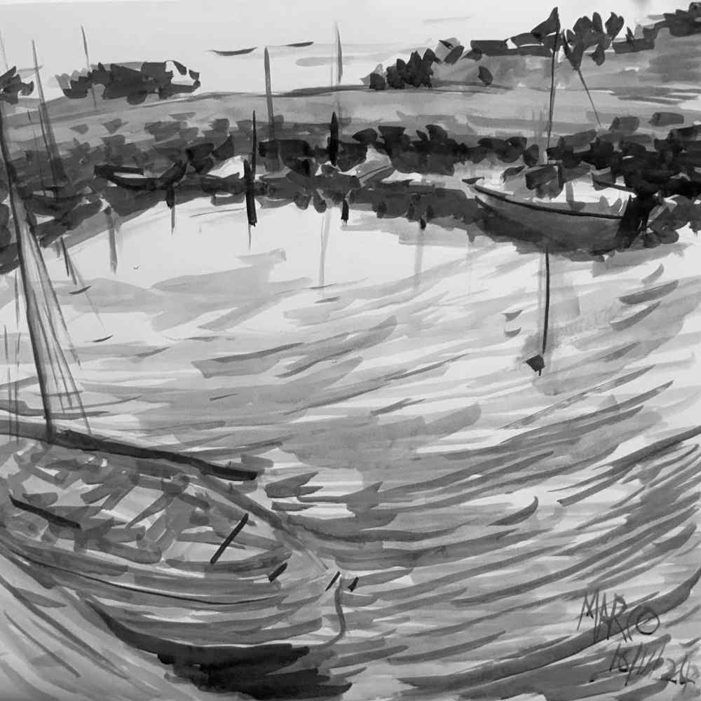 Je travaille souvent à partir de photos qui nourrisent mon appetit pour le dessin et l’illustration. Dans mes séries de carrés, on reconnaît parfois un rivage normand, une ruelle de Saint-Lô, un pan de falaise.