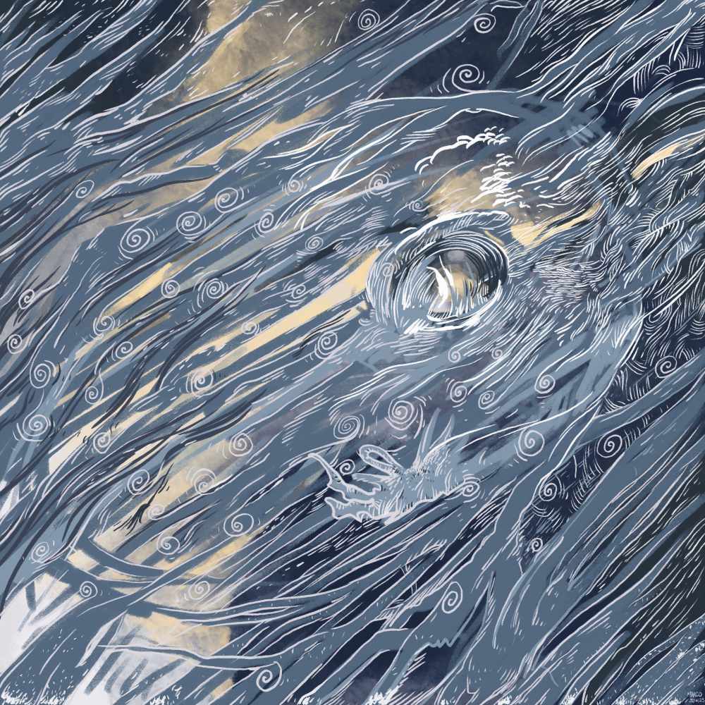 Un tracé en mouvement, proche de l’abstraction, inspiré d’un calamar dont on devine l’œil.